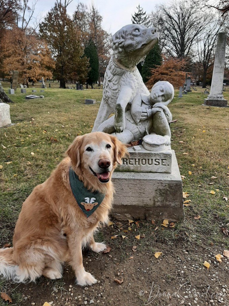 Another bit of history with the Boy & Dog monument happened in April, 2008, when the head of the dog was displaced from its perch. I was visiting the cemetery and was dismayed to see this demarcation of our city’s beloved monument. While taking a photo, a Woodland security guard drove past and yelled something from his car.