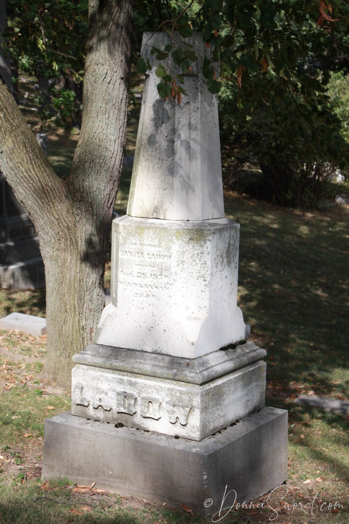Daniel La Dow, the designer behind the Boy and Dog, owned La Dow & Hamilton Marbleworks (later La Dow & Winder) located downtown on Third Street, between Jefferson and St. Clair Streets. He is buried at Woodland Cemetery as well. His monument is an impressive obelisk to honor the life of this generous man. I wonder if he designed this himself and feel that he very likely did.